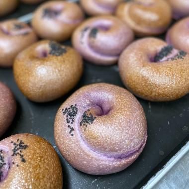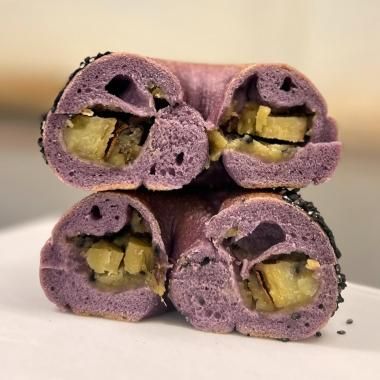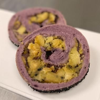 紫芋生地にさつまいも餡子と焼き芋、黒ごまを巻き込みました。